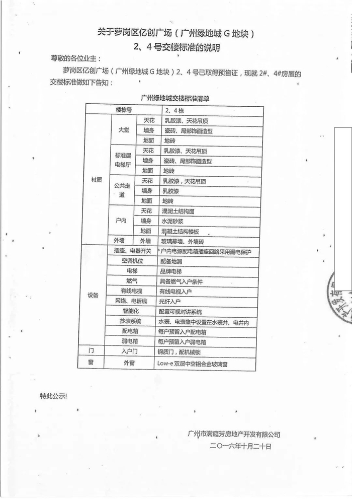 2016年10月20日,广州市满庭芳房地产开发有限公司发布一份《关于萝岗区亿创广场(广州绿地城G地块)2、4号交楼标准的说明》,2、4号已取得预售证,广州绿地城交楼标准清单印有“具备燃气入户条件”字样,再一次确认了这一事实。