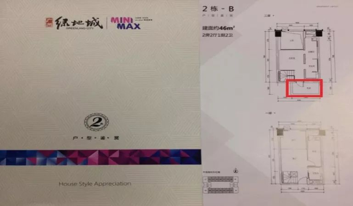 当时该楼盘的户型鉴赏宣传材料显示,广州绿地城公寓MINIMAX 2栋-B,建面约46/㎡,设计2房2厅1厨2卫,项目样板间也设置了厨房并配有燃气灶。宣传册明示,广州绿地城公寓核心亮点“明火煮食、独立阳台”。