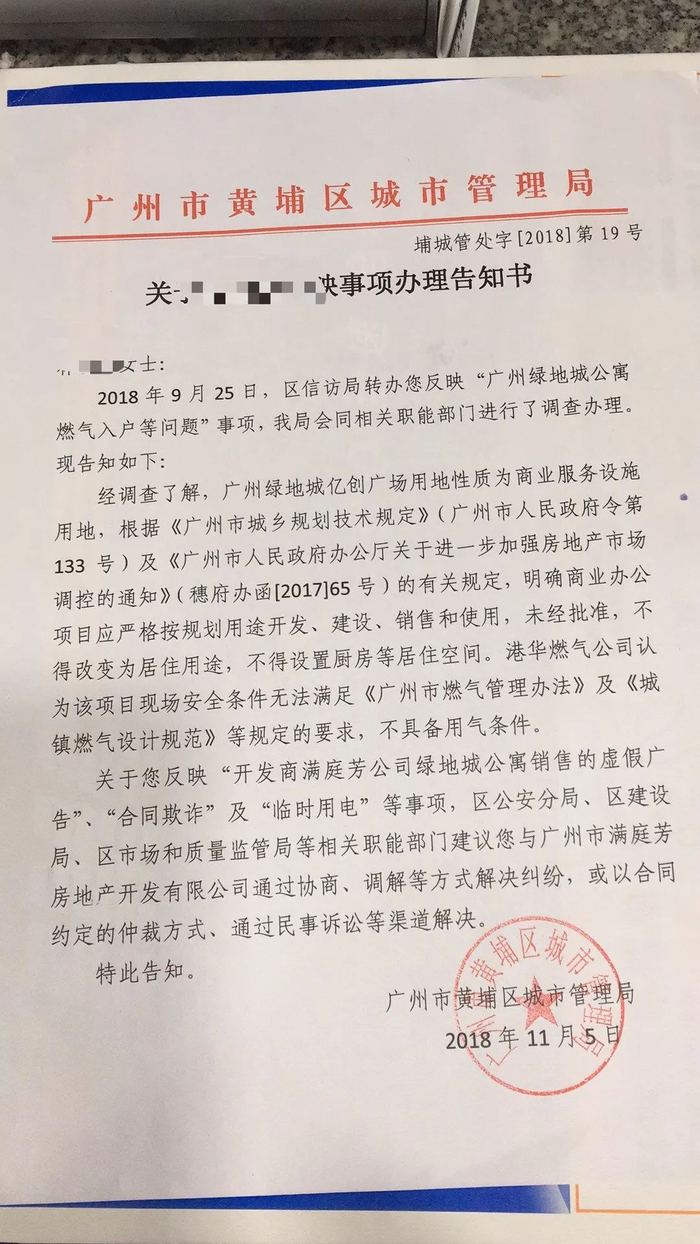 根据广州市黄埔区城市管理局2018年11月5日向业主出具的一份告知书,经调查了解,广州绿地城亿创广场用地性质为商业服务设施用地,根据有关规定,商业办公项目未经批准不得改变为居住用途,不得设置厨房等居住空间,港华燃气公司认为该项目现场安全条件无法满足规定要求,不具备用气条件。