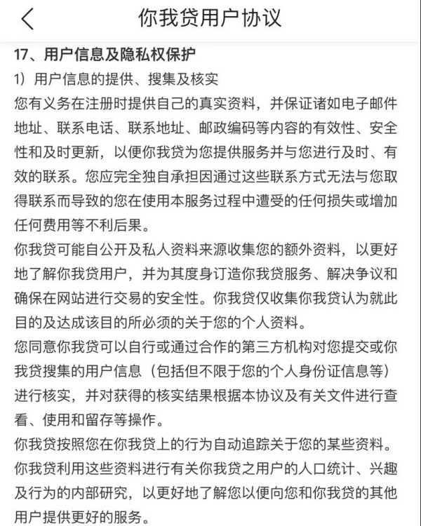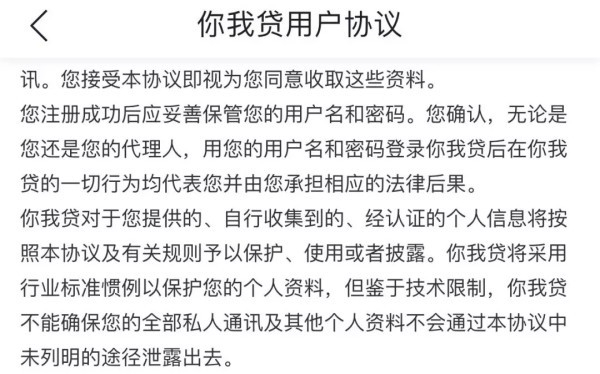 你我贷并没有告知用户,索取权限的理由和用途。在用户协议中的用户信息及隐私权保护部分当中,也没有提到《网络借贷信息中介机构合规检查问题清单》中对制定客户信息采集、使用及处理方面的安全保护制度,而且充满了大量疑似“免责条款”的嫌疑。
