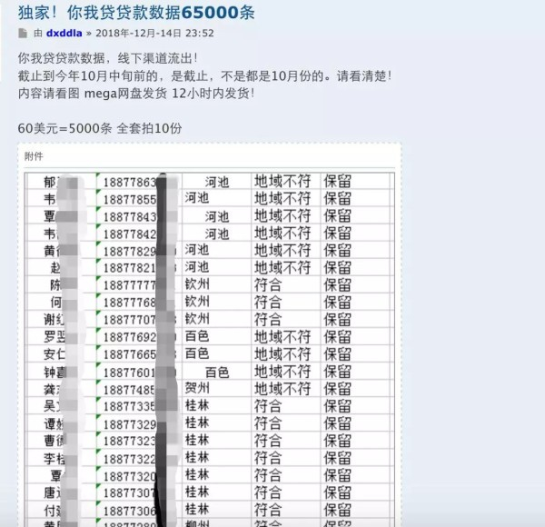 日前,据悉,P2P平台你我贷的65000条贷款数据在暗网被明码标价售卖。卖方称数据是从线下渠道流出,截止到今年10月中旬以前。5000条数据售价60美元,全套需要拍10份。