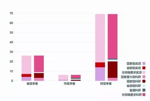如图所示,学者计划评选条件的个体差异化比较明显,众多校级学者对科研与奖项作出了较为明晰的要求,等级高低并不影响标准的升降。