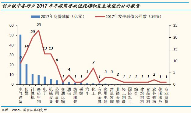 从计提商誉减值准备的公司数量分布来看:创业板中医药生物、计算机、传媒、电子、机械设备行业分别有23、20、14、13、13家公司在2017年计提了商誉减值准备准备,分别占创业板中该行业公司总数的28.05%、19.42%、35%、18.06%、12.75%。