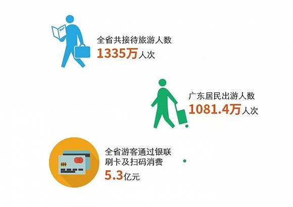 ▲广东旅游总体情况,数据来源:广东移动蜂巢大数据、广州银联网络大数据据统计,3天假期全省共接待旅游者1335万人次,广东居民出游1081.4万人次,全省游客通过银联刷卡及扫码消费5.3亿元人民币。假日期间,全省未发生重大旅游安全事故和重大旅游服务质量投诉。