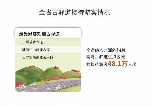 ▲14段南粤古驿道重点区域接待情况,数据来源:广东移动蜂巢大数据据统计,假日期间,全省纳入监测的14段南粤古驿道重点区域共接待游客48.1万人次,广州从化古道、珠海中山岐澳古道、云浮郁南南江古水道成为最受游客欢迎古驿道。