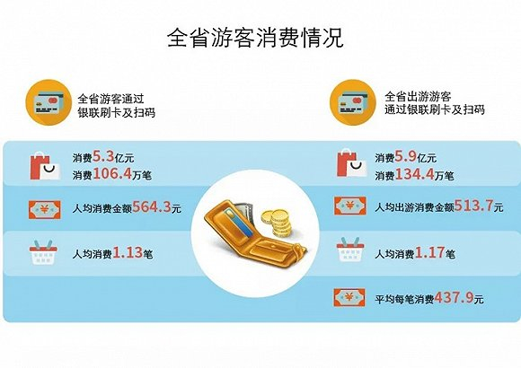 据银联大数据显示,全省游客通过银联刷卡及扫码消费5.3亿元,消费106.4万笔,人均消费金额564.3元,人均消费1.13笔。全省出游游客通过银联刷卡及扫码消费5.9亿元,消费134.4万笔,人均出游消费金额513.7元,人均消费1.17笔,平均每笔消费437.9元。