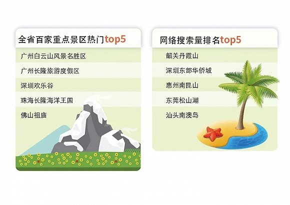 ▲百家重点景区接待游客与网络搜索量排行,数据来源:广东移动蜂巢大数据、百度旅游大数据广东全省纳入监测的百家重点景区共接待游客197.5万人次,纳入统计的13家红色旅游经典景区共接待游客36.0万人次。全省百家重点景区接待游客前五为广州白云山风景名胜区、广州长隆旅游度假区、深圳欢乐谷、珠海长隆海洋王国、佛山祖庙。节前通过百度搜索最多的景区前五分别为韶关丹霞山、深圳东部华侨城、惠州南昆山、东莞松山湖和汕头南澳岛。
