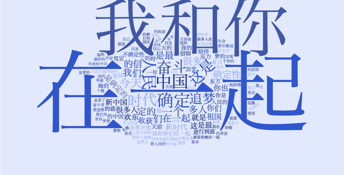 央视新闻今年的新年献词以“我和你,在一起”为题,全文的主要段落都以此句式为主题句,反复出现,构成有序的结构;提到了新中国成立70周年、中美建交40周年等重要纪念日;强调在改革开放的背景下,为实现中国梦,全国人民一起凝聚共识,共同奋斗。