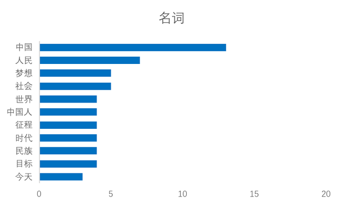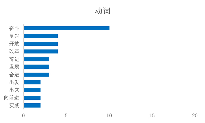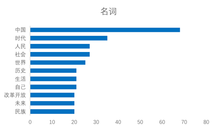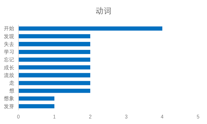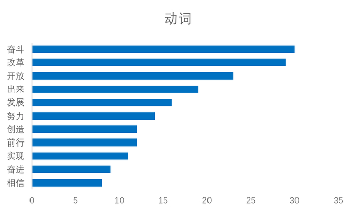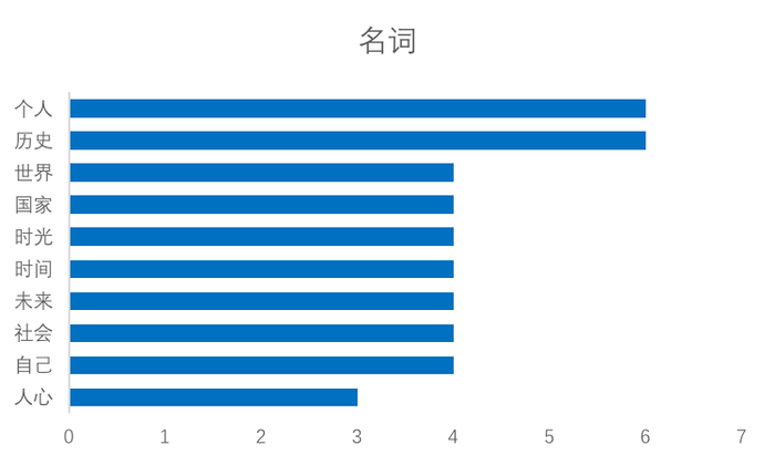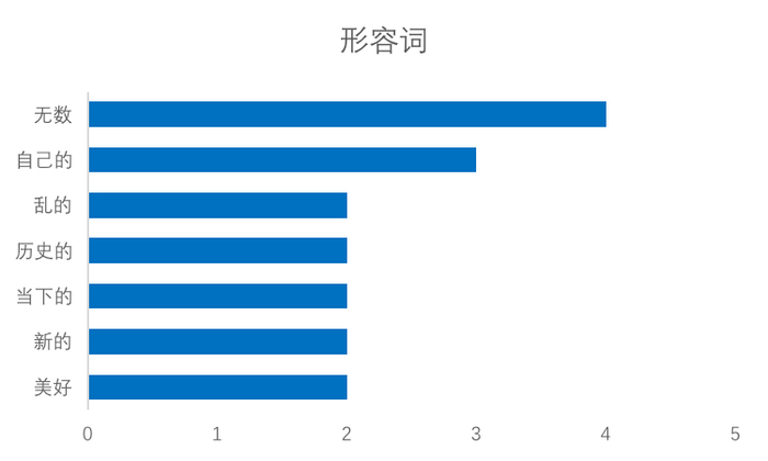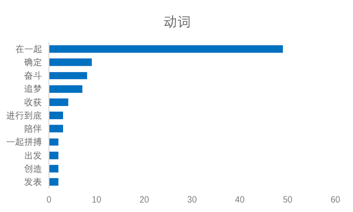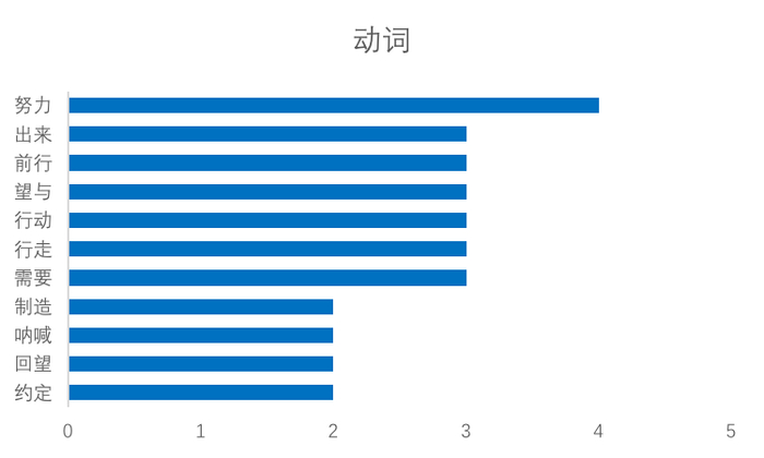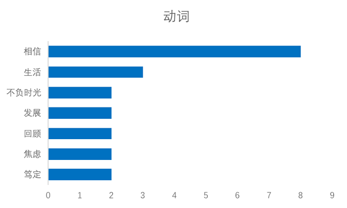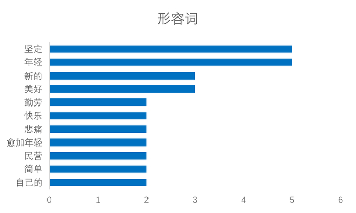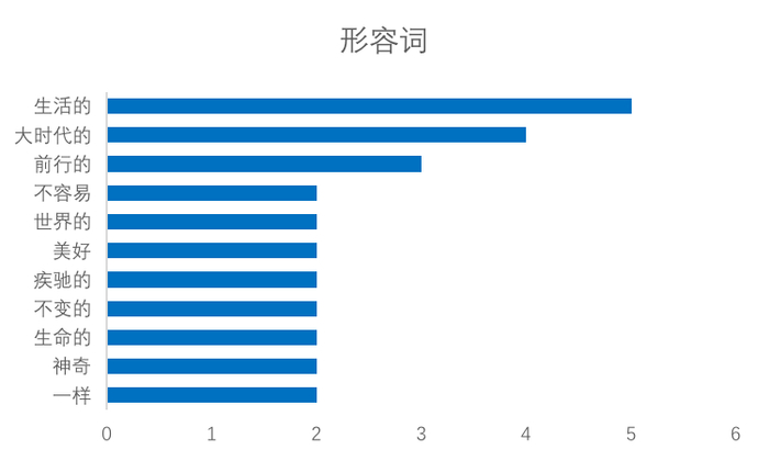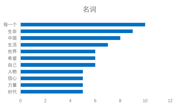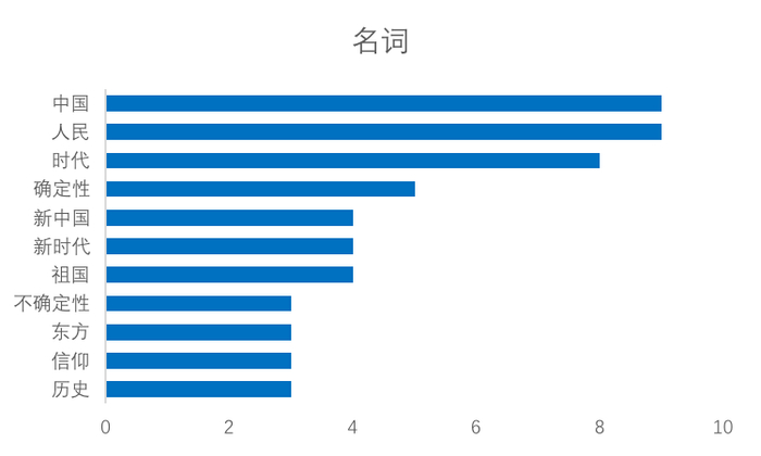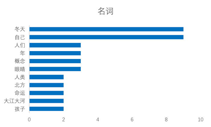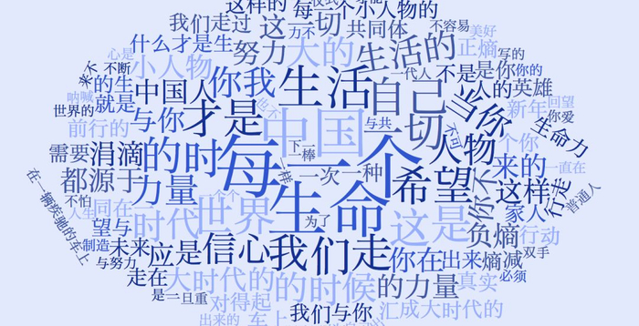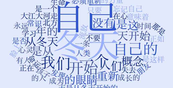澎湃的新年献词中,名词“冬天”和“自己”分别出现了9次。动词“开始”出现了4次,形容词“自己的”出现了4次。由于篇幅较小,相比其他新年献词,该篇并没有特别突出的关键词。澎湃的该篇新年献词以“冬天”和“春天”为喻,强调“春天是从冬天开始的”,关注生活中的困难与挑战,传递着无所畏惧,积极进取的激扬情怀。
