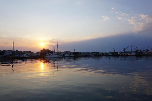 大町有一处延伸到海中的绿之岛公园,在这里可以将函馆湾的景色尽收眼底。西侧是函馆造船厂停泊的船只,东侧能看到海湾旁边金森仓库红色的砖墙,对面则可以一直望到远方的山峦。宁谧的夕阳将光辉撒在平静的海湾上,两个人吹着有点寒意的风,看海面上摇曳着的光,对我来说已经足够浪漫了,我差点就打消了去函馆山上看夜景的念头。