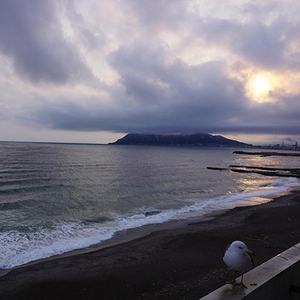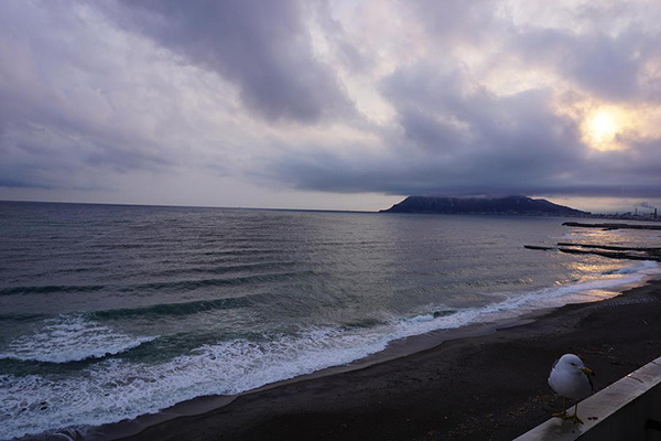 第二天早上雨过天晴,平静的海湾沿着绵长的海岸线铺展开来,能一直望到函馆山和伸向海中的岬角。成群结队的海鸥在半空中盘旋。