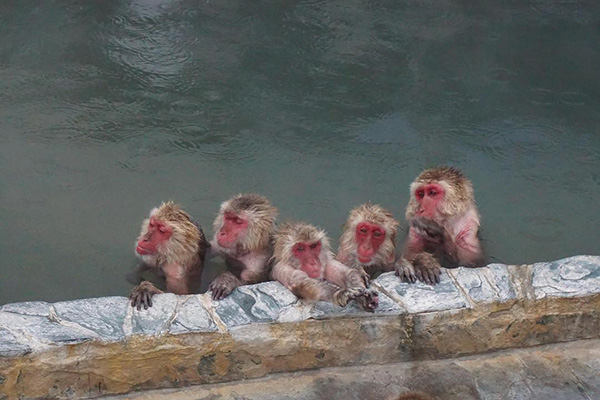 天空中落着细细的雨,我们撑着伞,任由自己在凄风冷雨中也还是乐此不疲地看着温泉里的猴子们兀自享受着宁静午后时光。游客很少,一共只有六七个人。一对上海老阿姨执着地探讨着猴子到底本来屁股就是红的还是泡温泉烫红的,还有一对日本母子买了饲料喂猴子,小男孩还喊我“ouneisang”,分给我一块猴饼干。可是比起猴饼干,大部分猴子显然还是更喜欢温泉。