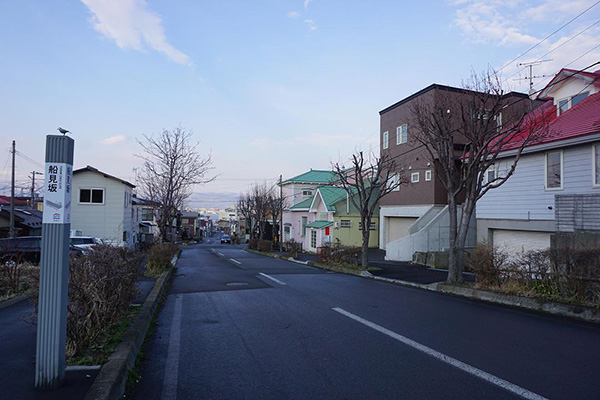 弁天岬台场迹所在的鱼见坂是函馆元町地区12条坂道中最西边的一条,也是离海最近的一条,传说从前站在坂道上方就能看见海里的鱼群。坂道两侧的建筑稀稀落落的,清一色的二层小楼。行道树还没长出叶子,光秃秃的枝干伸向天空。西斜的阳光透过云层,略过树枝的顶端,在潮湿的路面上拉出很长的影子。街上静得只剩下海鸥和乌鸦的叫声,要不是偶尔有汽车和骑单车的人经过,我简直以为自己落入了异次元的平行世界。