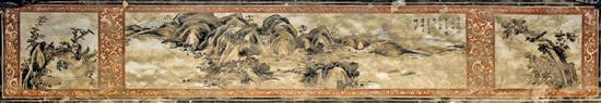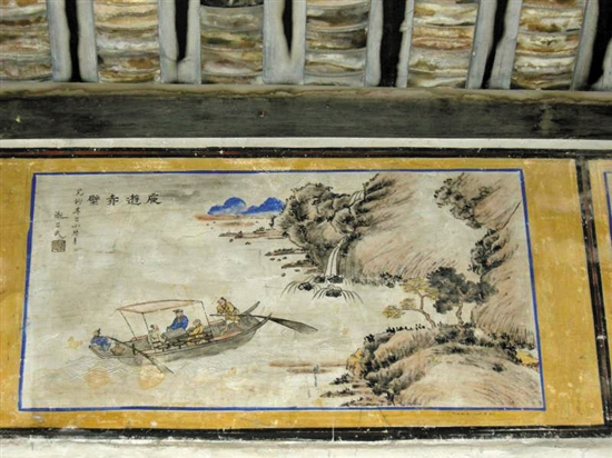 《山水画》 清光绪七年(1881年), 绘画者:潘漱石。款识:“夜游赤壁。光绪七年辛巳小阳月。漱石氏。” 这是广府壁画名家潘漱石的一幅作品,根据苏东坡《前赤壁赋》而作,充分展示了“壬戌之秋,七月既望,苏子与客泛舟,游于赤壁之下。清风徐来,水波不兴”的意境。 壁画位置:位于广州市白云区嘉禾街联边村坚祖彭公祠