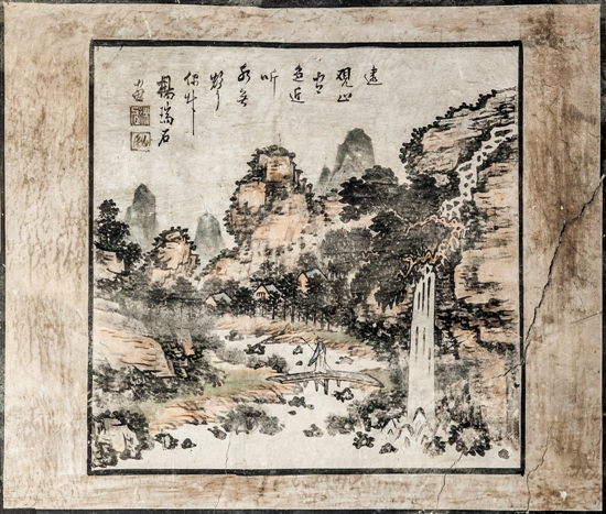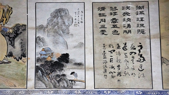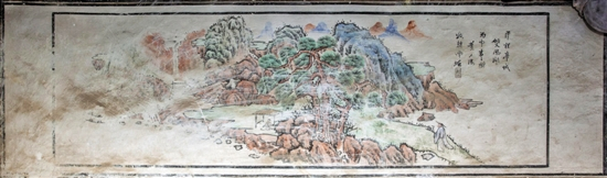《山水画》 同治六年(1867年),绘画者:杨瑞石,款识:“空山新雨后,天气晚来秋。明月松间照,清泉石上流。竹喧归浣女,莲动下渔舟。随意春芳歇,王孙自可留。杨瑞石画。” 壁画的款识录自唐代诗人王维的《山居秋暝》诗,右边的独幅书法是唐代李白名诗《秋登宣城谢脁北楼》:“江城如画里,山晓望晴空。两水夹明镜,双桥落彩虹。人烟寒橘柚,秋色老梧桐。谁念北楼上,临风怀谢公。” 壁画位置:广州市番禺区石楼茭塘东村表海黄公祠