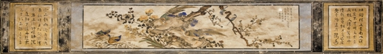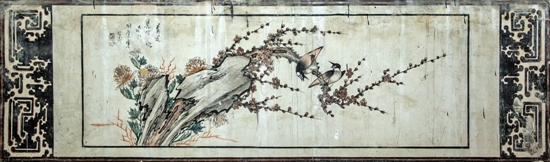 《花鸟画》 光绪三十一年(1905年) 绘画者:韩炽山。款识:“莫道花开晚,谁能耐雪寒。偶作。” 款识赞美梅花虽然晚开,但抗雪耐寒,是花中之冠。 壁画位置:广州市番禺区化龙镇潭山村竹溪公祠