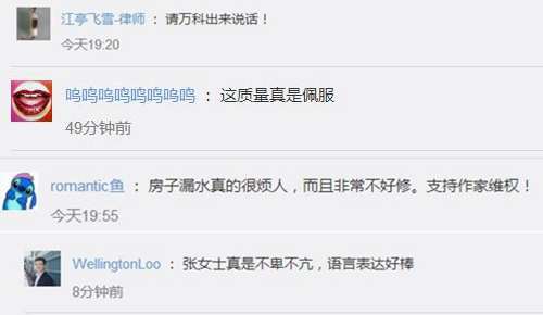 网友纷纷评论:“请万科出来说话,这质量真是佩服,张女士真是不卑不亢,语言表达好棒,支持作家维权。”
