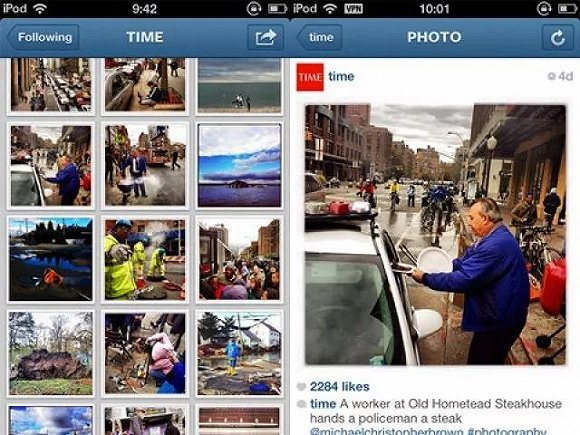 一年后,专业新闻机构开始在正规报道中采用 iPhone 拍摄的照片和 Instagram。2012 年,桑迪飓风肆虐,《时代》杂志先驱性地以 Instagram 为主阵地,找来五名专业摄影师,让他们在《时代》的 Instagram 上发布新闻照片。其中一张照片甚至被选作《时代》的封面。