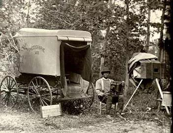 《中国摄影》一篇文章这样描述 19 世纪中期流行的湿版摄影法,“摄影师外出拍摄时必须携带着遮光的帐篷、化学药品、玻璃片、笨重的支架以及一壶水,全套装备通常是整整一马车”。