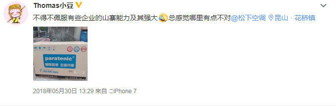 也有网友在微博晒出标有“paratenic”标志的产品,称:“不得不佩服有些企业的山寨能力极其强大,总感觉哪里有点不对。”并@松下空调。