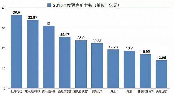 《红海行动》(36.5亿)、《唐人街探案2》(33.97亿)、《我不是药神》(31亿)、《西虹市首富》(25.47亿)四部国产片包揽年度票房前四名。