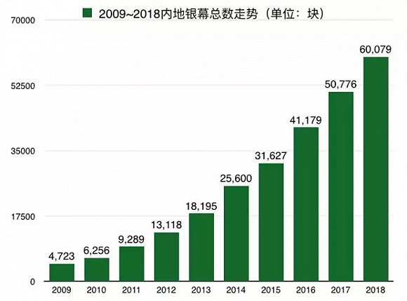 2018年全国新增银幕9303块,银幕总数达到60079块。银幕数量第一大国的地位更加稳固。