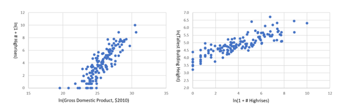 也即,一国的经济规模越大时,所拥有的摩天大楼数量也越多,而摩天大楼的数量,又和最高建筑的高度存在正相关关系。