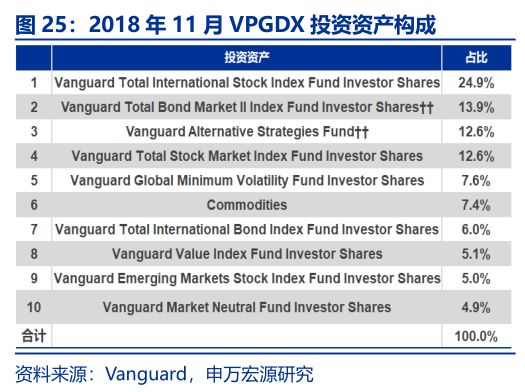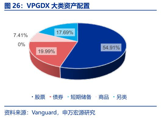 Conservative Growth Funds、Lifestyle Moderate Growth Fund、Lifestyle Growth     Funds),按照投资目标更着眼于当下收入还是未来收入的不同,股票投资占比依次提高,费率同样依次提高但仍然保持绝对优势,4支基金费率依次为0.11%、0.12%、0.13%、0.14%,而行业同类型基金对比费率为0.69%。