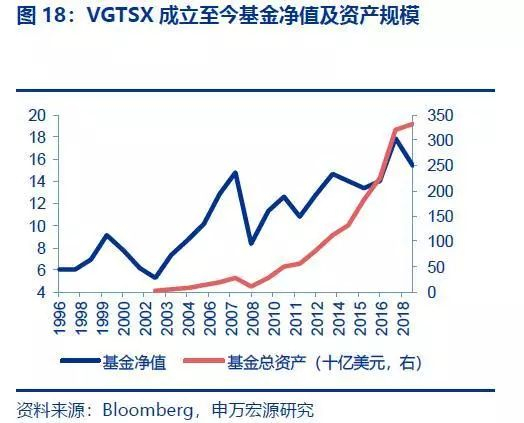 VGTSX规模爆发式增长,十年复合增速27.3%。先锋整体海外股票指数基金作为参与国际市场配置的指数基金,近十年规模增长较快,年均复合增速高达27.3%。