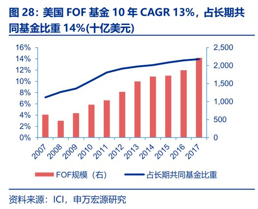 2017年末规模突破2.2万亿美元。FOF基金(Fund of Fund,基金中的基金,或称组合基金)是绝大部分资产投资于其他的基金,近年来在美国的占比不断提升。退休金的发展为美国公募FOF基金的发展提供了源源不断的长期资金,2017年末,美国FOF基金规模2.22万亿美元,占美国长期共同基金之比提升至13.9%,近十年复合增速高达13.3%,成为美国资本市场中重要的投资力量。与传统的基金相比,FOF基金优势主要包括投资更加专业、风险分散能力更佳、大类资产配置、降低多样化投资门槛。