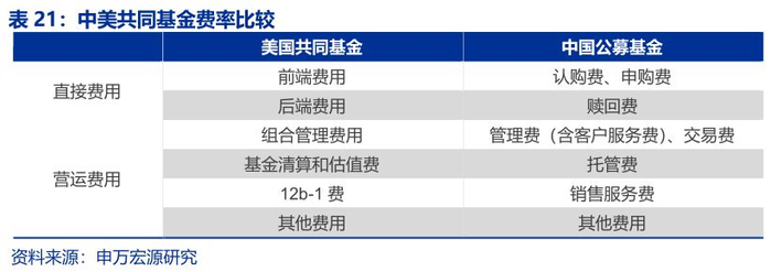 以先锋为典型代表的美国明星基金公司并不支付销售佣金,中国公募基金的销售服务费用相当于美国12b-1费用,我国基金投资者支出费用中相当部分付给了销售机构,此外,托管费存在增加了基金成本。按照销售渠道划分,美国共同基金销售主要包括直销与分销,分销渠道又包括通过雇主养老计划、专业投资机构、基金超市或折扣券商等(如先锋集团2017年通过养老计划销售的规模为1.19万亿美元,占比24.1%)。在美国经验中,12b-1费用用于补偿代销机构在基金销售活动中的开支,但不高于1%,12b-1费用降低了前端费用支出,同时极大推动了美国共同基金的营销发行。中国当前有1/3的公募基金收取销售服务费,费率介于0.01%-1.5%/年之间。客户服务费是基金公司将管理费收入的一定比例付给代销机构,对于中国公募基金而言,投资者支出费用中相当一部分最终付给了销售机构(代销机构收入=前端申购费+销售服务费+客户服务费+赎回费的部分)。