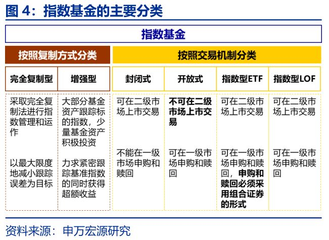 指数基金采取拟合目标指数的投资策略,分散投资于目标指数的成分股,力求使基金组合的收益率与目标指数的跟踪误差最小。按复制方式分类,指数基金可以划分为完全复制型指数基金、增强型指数基金。按交易机制分类,指数基金可划分为封闭式指数基金、开放式指数基金、指数型ETF、指数型LOF,本文主要讨论开放式指数基金。开放式指数基金区别于指数型ETF的特征是不可在二级市场上市交易,但可在一级市场申购和赎回。