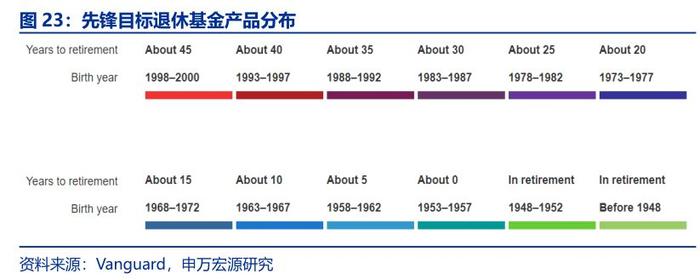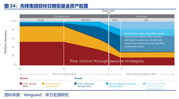 先锋基于为客户提供一站式养老金储蓄服务的理念,推出美国首支公募FOF,目前是美国最大的FOF管理人,先锋的FOF基金主要运用于养老金的投资管理。1982年,美国养老金制度开始深入改革,401(k)兴起,与此同时,先锋开始为投资者提供养老计划投资服务;到1985年,先锋推出首支FOF基金,旨在为客户提供一站式服务,设计思路是在单支基金中实施分散化的资产配置,为个人投资者未来退休、入学或其他特定目的投资的提供便捷的投资方式,力求一支基金满足特定投资目标。此后,FOF产品种类日益丰富,公司一站式基金主要包括四大类——退休储蓄、入学储蓄、管理退休收入、特定事件或目标储蓄,与之对应的四类型基金——目标日期系列基金、529计划、目标退休收入基金、生活策略基金等。其中,目标日期系列与生活策略系列规模占比先锋FOF总规模近9成。目前,先锋目标日期基金个人系列、机构系列产品各11支,目标退休收入管理基金个人份额、机构份额产品各1支,生活策略系列基金4支、收入管理支出基金1支。