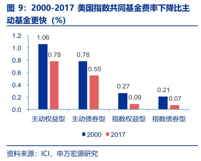 在美国。低费率是指数基金区别于主动基金的核心优势,美国股票型指数基金、债券型指数基金费率仅为主动股票型基金、债券型基金费率的1/9、1/8。市场竞争加剧下基金产品费率下降为大势所趋,21世纪以来,美国基金行业费率屡创新低,但被动型指数基金费率下降比主动型产品更快。2000年,主动股票型基金费率约为指数股票型基金费率的3.9倍,2017年已经扩大至8.7倍;主动债券型基金费率为指数型债券基金费率的7.9倍,也反映了被动型基金的规模经济特征。