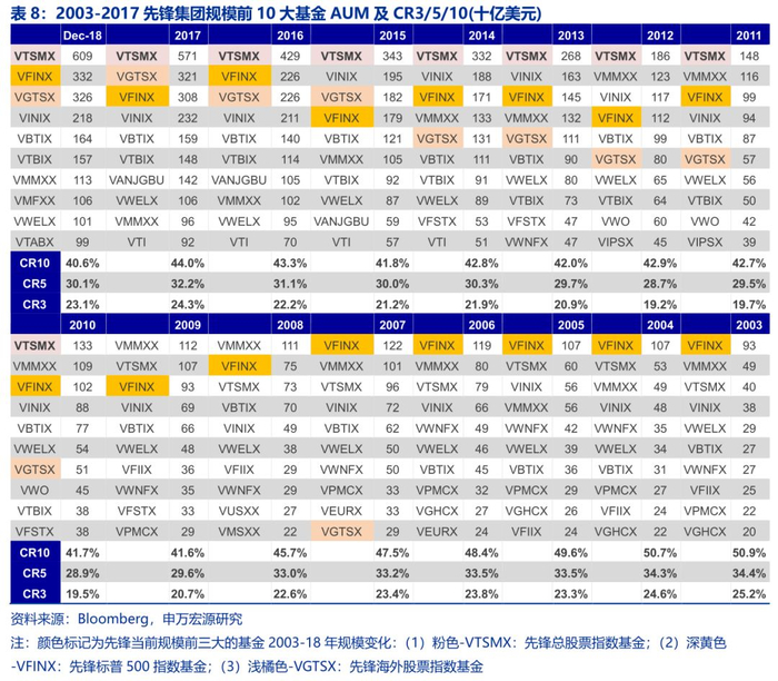 先发优势与规模经济推动费率持续下降,使得先锋集团AUM持续增长,三大指数基金产品AUM增长贡献集团AUM增长超过30%。梳理2003-今先锋集团规模前10大的基金产品,均以市场指数和货币基金类产品为主,且前10大指数基金产品占总规模的比重基本保持在40%以上,前5大规模产品占比在30%以上,前3大规模产品占比在20%以上。截至2019/1/3,先锋集团规模最大的三支指数产品分别为VTSMX 6238亿美元、VFINX 3389亿美元、VGTSX 3314亿美元,占集团总AUM的1/4。