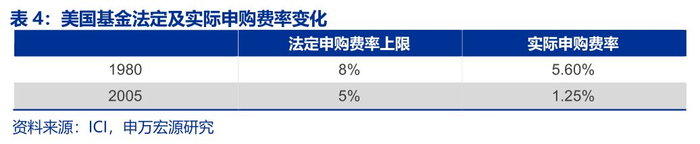 申购费用率不断下降,大部分共同基金取消前端收费。申购费作为一种前端费用(Front-end load),在基金持有人购买时收取,作为固定成本影响基金持有人的购买需求,目前,许多美国基金公司采用极低的申购费率或者免申购费用。