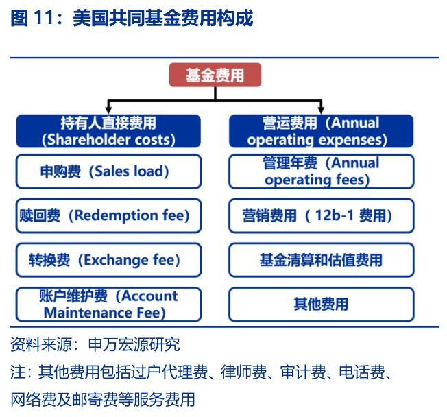 在美国,共同基金的费用可以分为基金持有人直接费用和基金营运年费。直接费用(Shareholder costs)在交易发生时承担,由基金购买人一次性支付,包括申购费、赎回费、转换费、账户维护年费等。基金营运费用(Annual operating expenses)则将每年在基金的净资产中按一定的比例扣除,包括管理年费、营销费用(12b-1)、其他费用等。