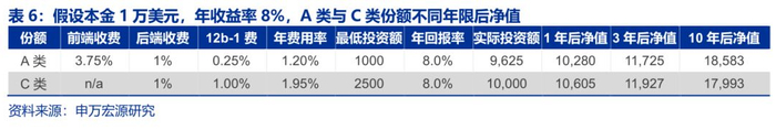 在零费基金未兴起前,A类份额是退休金等长期资金的更优选择,C类份额是短期资金的更优选择。若投资期限较长,A类份额总回报率更高。我们以初始投资本金1万美元为例,某基金对A类份额收取0.25%的12b-1手续费,对C类份额收取1%的12b-1手续费。假设A类份额前端收费为3.75%,C类无前端收费,则初始投资额为9625美元、10000美元;在年回报率为8%的假设下,持有1-3年均为C类份额收益更佳,而10年则A类投资收益更佳。