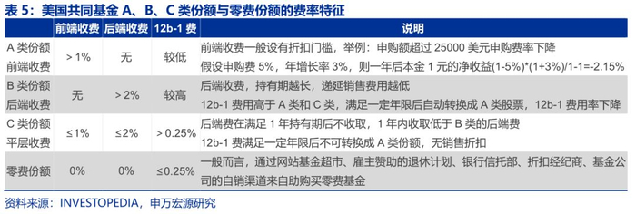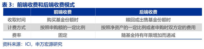 后端收费逐渐被12b-1费用所取代。后端收费(Back-end load)一般按净资产比例收取,设计为随持有年限的增加而降低费率,超过一定年限后可免费,可避免持有人在获益前就支付高成本的不合理情形,一定程度上约束了投资者的赎回及抛售行为;但随着市场竞争加剧,后端收费模式逐渐被免费基金所替代。