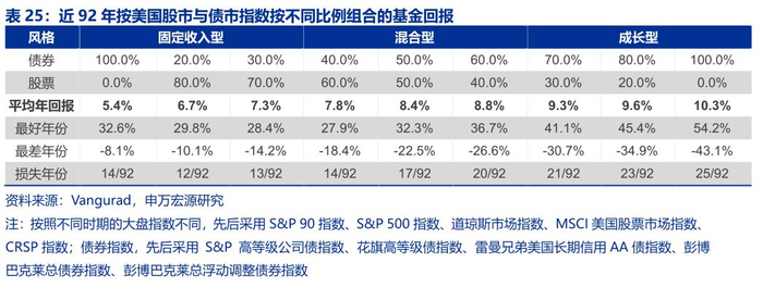 美国市场的相对有效为指数基金的长期发展提供了重要经验根据。1926-今,美国股票市场指数平均年回报率超过10%,且股指下跌年份为25年,上涨的年份共92年,该特性使得指数基金尤其是股票型指数的发展有其回报基础。从下表可以看到,随着股票占比的提升,平均年回报率在提升,但是回报的波动率在增大。