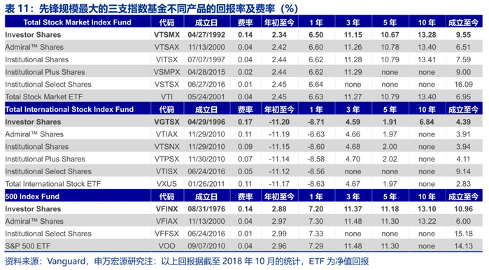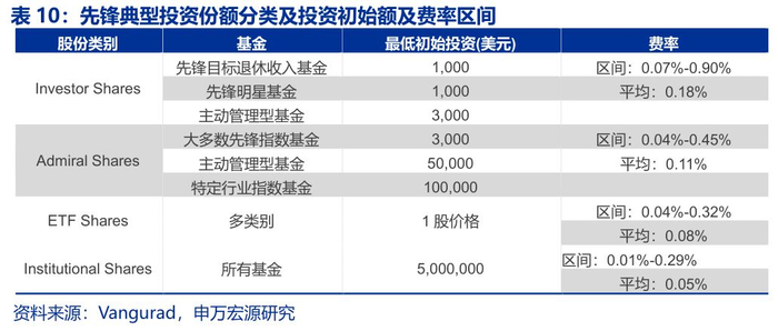 先锋集团基于投资额不同,对跟踪同一指数的基金推出了5类投资份额,费率随投资额提升而递减,最低至0.01%。早期产品均为Investor Shares,主要针对零售客户,起投点一般为3000美元(目标退休基金低至1000美元);1997年,推出了Institutional Shares,主要针对机构客户,起投点为500万美元;2000年,推出了Admiral Shares,起投点设立为10000美元,但费率相较于Investor Shares明显降低,以跟踪S&P 500指数的VFIAX为例,管理费率0.04%,不到Investor Shares的VFINX的1/3;2010年、2016年相继推出了Institutional Plus Shares、Institutional Select Shares,最低投资额分别为1亿美元、5亿美元,如追踪总股票市场指数基金的VSMPX、VSTSX,费率进一步压降至0.02%、0.01%。截至18年10月,先锋CSRP总股票市场指数基金、总海外股票指数基金均设置5种份额,先锋标准普尔500指数基金设置了3种份额。