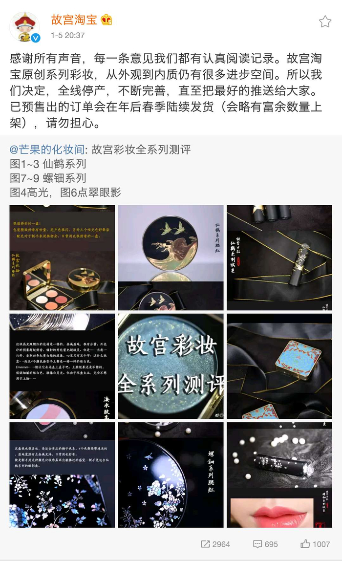 尽管网友高呼“不要停”,1月5日, 距上线不到1个月,故宫淘宝宣布停产彩妆。故宫淘宝官方给出的理由是,产品从外观到内质仍有很多进步空间,例如外观不够高级,眼影珠光颗粒不够精细,部分颜色有飞粉现象,点翠蓝色实用度欠佳。