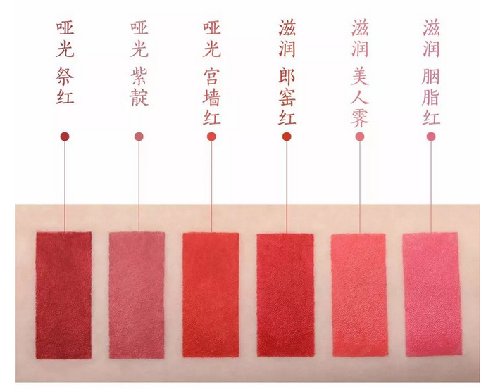 例如,故宫淘宝推出的彩妆分为“故宫仙鹤系列”和“故宫螺钿系列”两个系列,前者外包装为黑底绘金色梅花仙鹤图,后者黑银相间、绘有花鸟图。两个系列的口红颜色都分为哑光祭红、哑光紫靛、哑光宫墙红、滋润郎窑红、滋润美人霁、滋润胭脂红六个色号。此外,还包括故宫点翠眼影和高光粉。