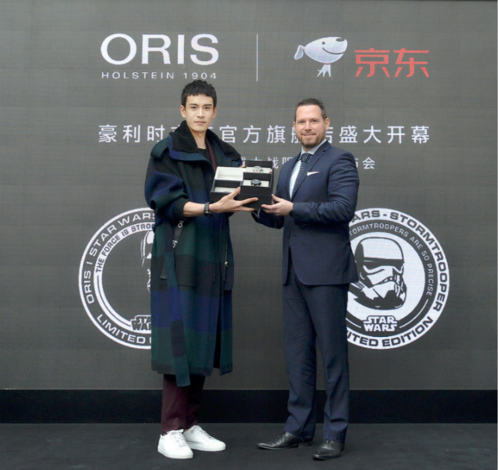 2019年1月7日,百年瑞士独立制表品牌豪利时(ORIS)于北京京东大厦举办豪利时京东旗舰店开幕活动,同时正式发布了豪利时与星球大战(STAR WARS)合作的两款限量版联名腕表:豪利时星球大战达斯维达限量版和豪利时星球大战帝国冲锋队限量版。豪利时大中华区总裁David Weber先生、京东商城时尚事业部钟表业务部总经理陈婉女士、豪利时合作伙伴启怡华嘉集团总经理张岚女士、豪利时品牌好友、国内知名男演员经超先生出席本次活动。豪利时携手国内电商平台京东,正式宣布豪利时京东旗舰店开幕。本次豪利时与星球大战合作推出的限量版腕表也于日前在京东开启线上独家预售。