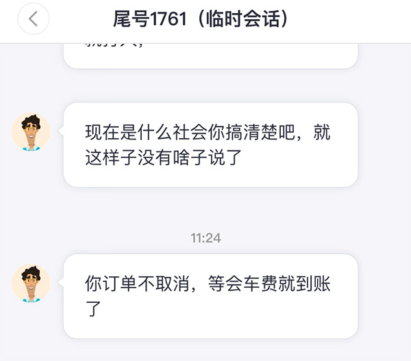 在李某告知对方自己正报警时,车主却回复“现在是什么社会你搞清楚吧,就这样子没有啥子说了”,还称“订单不取消,等会车费就到账了”。