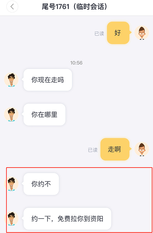 根据微博所发及陈某提供的聊天记录,李某和接单车主“尾号1761”在平台的临时会话中,李某同意车主再接一个人的要求后,车主在当天10时56分发来信息问她“现在走吗”。李某回复“走啊”后,车主却发来“你约不”、“约一下,免费拉你到资阳”的信息。也许是出于气愤,李某回了一句“想不想挨打嘛”,但车主却称他在派出所,自己在里面等她。
