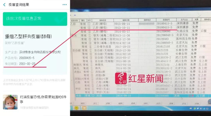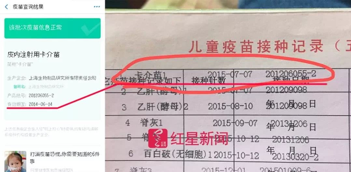 据几位金湖县家长向红星新闻记者提供的儿童疫苗接种记录,红星新闻记者通过阿里健康官方平台的“疫苗快查”查询到,批次为“20130320-2”的百白破疫苗有效期至2015年3月29日,有两名儿童分别在2015年10月12日、2016年1月11日接种该批次疫苗;另一批次为“201206055-2”的卡介苗疫苗有效期至2014年6月14日,一名儿童在2015年7月7日接种该批次疫苗,最长已过期了一年。
