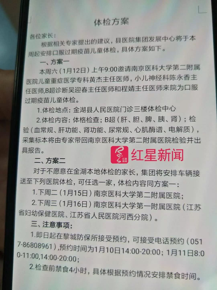 红星新闻记者看到,金湖县人民医院给家长群发了有关体检方案的短信,称医院将于本周起安排口服过期疫苗儿童体检,家长可选择12日带孩子至县人民医院门诊接受南医大二附院专家体检,也可由集团车辆送至南医大一、二附院检查。体检项目包括,体格检查、B超、血常规等。