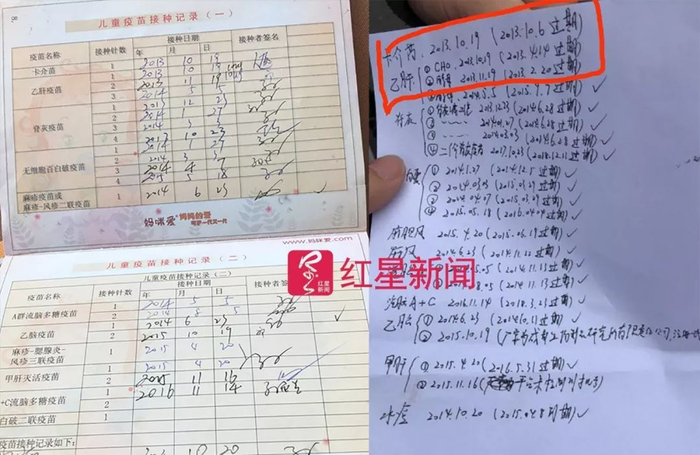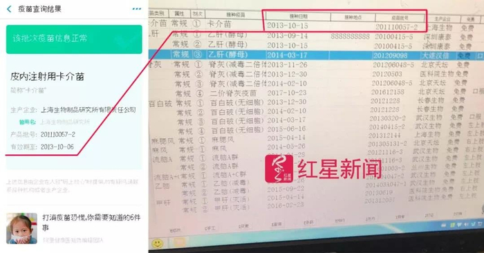 目前,红星新闻记者接到家长反映,并经过查询有效期与接种日期比对,脊灰、百白破、卡介、乙肝四类疫苗共5个批次存在过期接种。批次分别为:脊灰疫苗“201612158”、百白破疫苗“20130320-2”、卡介疫苗“201206055-2”、卡介疫苗“201110057-2”、乙肝疫苗“20100415-5”。