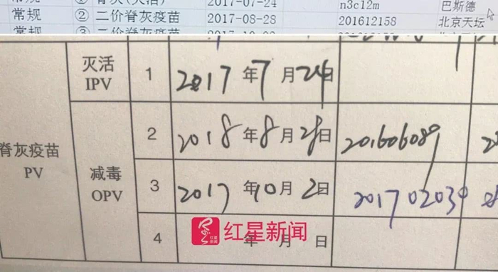 虽然在1月10日开放查询,但有家长反映,10日早上去金湖县防保所查询疫苗接种记录,显示同一针疫苗的批号与当时在疫苗接种本上填写的不同。一位家长向红星新闻记者出示了孩子的疫苗本记录,上面显示:2018年8月28日,接种的脊灰疫苗批号为“201606089”,但他在防保所查询到的疫苗批号却为“201612158”。同时,疫苗本上脊灰疫苗第二针时间记录有误,应为2017年8月28日,写成了2018年8月28日。